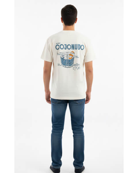 Cream-colored T-shirt with a “Yo Soy Cojonudo” print on the back, including an illustrated recipe for our cojonudo cocktail.