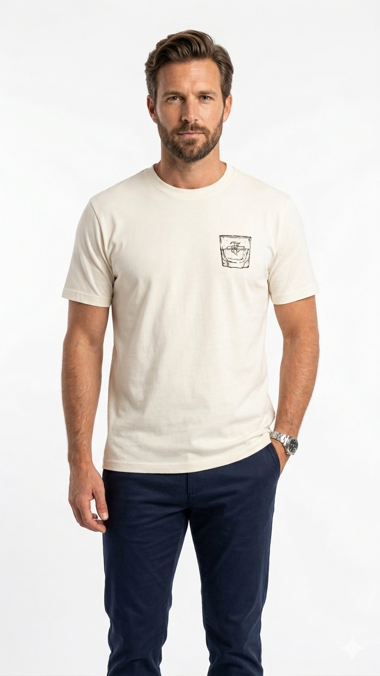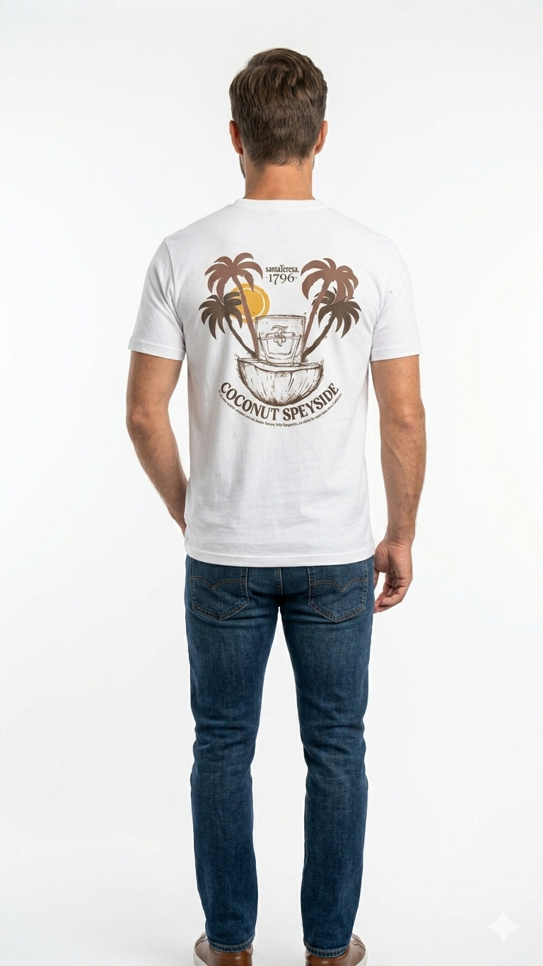 Camiseta color crema con estampado «Coconut Speyside» en la espalda, incluyendo ilustración de nuestro cóctel.